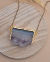 This statement raw cut amethyst makes for a striking pendant. It is electroformed along the top and side edges and gold plated and I've strung it on my statement brass faceted ball chain that has amazing shimmer and sparkle. It's a long over the head length so I've used no clasp for simplicity.
